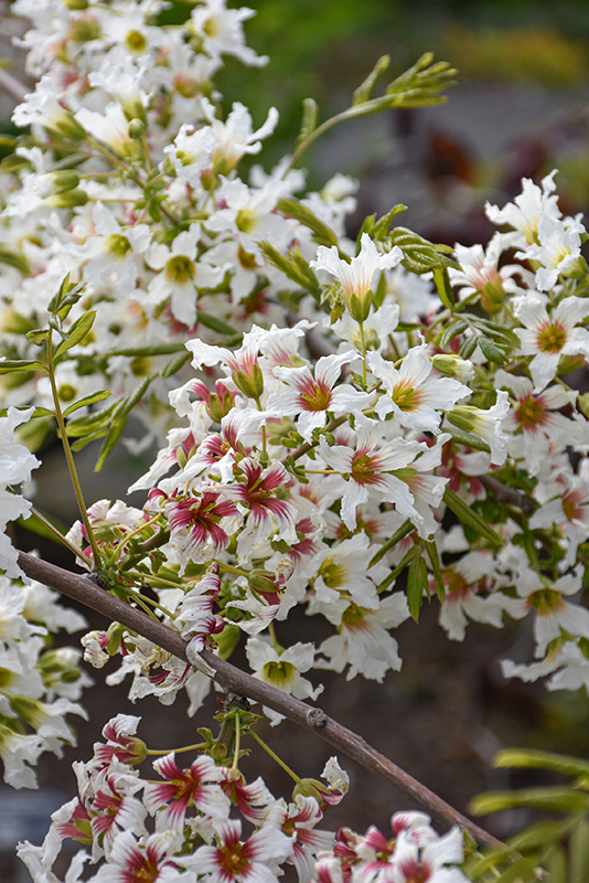 Clear Creek® Golden Yellowhorn is covered in stunning racemes of white trumpet-shaped flowers with chartreuse throats and antique red centers rising above the foliage in mid spring before the leaves. It has dark green deciduous foliage. The narrow pinnately compound leaves do not develop any appreciable fall colour. The fruits are showy brown pods displayed from early to mid fall.