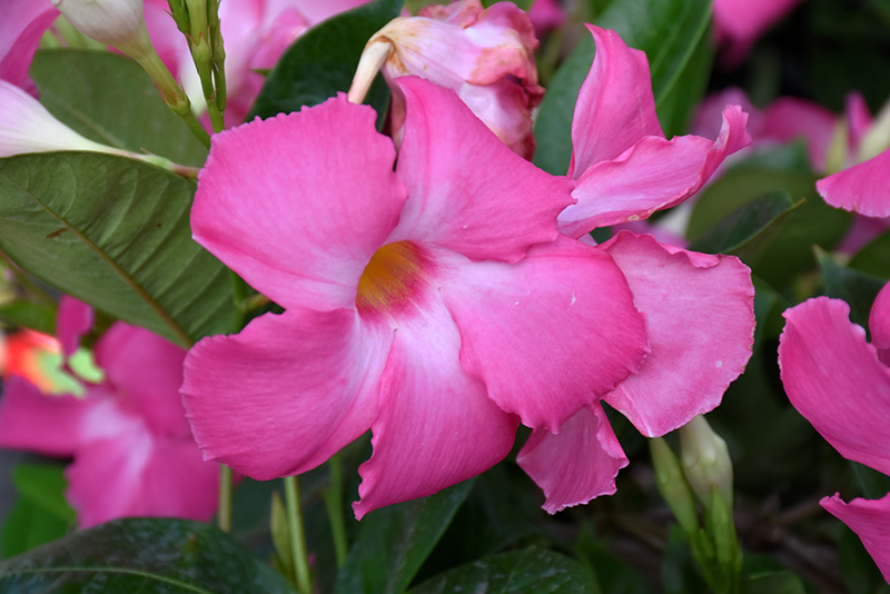 Diamantina™ Jade Rose Bush Mandevilla features bold rose tubular flowers with shell pink overtones and gold throats along the branches from late winter to late fall. Its large glossy pointy leaves remain dark green in colour throughout the year.