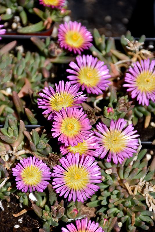 A low growing carpet-like, succulent, native to South Africa but amazingly hardy in North America; dazzling pink, daisy-like flowers with bright yellow centers; perfect for xeriscapes, rock gardens, screes and sandy soils