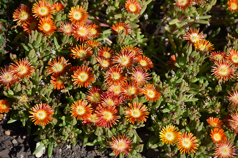 A low growing succulent, native to South Africa but amazingly hardy in North America; bright scarlet red daisy-like flowers with yellow centers; green foliage has burgundy overtones in fall; perfect for xeriscapes, rock gardens, screes and sandy soils
