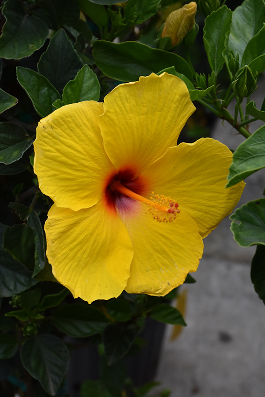 This bright and colorful variety features an upright habit bearing large, yellow blooms with bright red eyes; makes an ideal hedge, screen, or background planting; do not allow to dry to wilting point