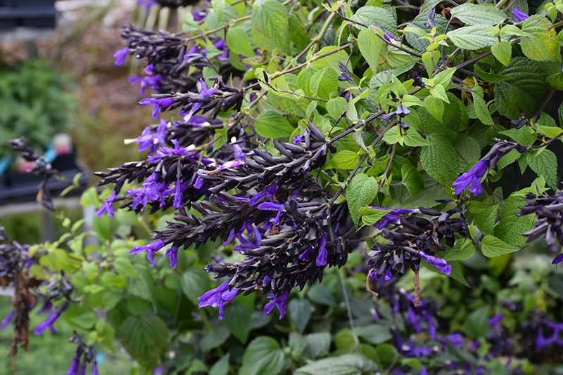 A compact and trailing variety, producing pagoda-like whorls of indigo blue flowers with striking black calyces on short, 4" stems; arrow shaped deep green leaves are aromatic; great for dry, sunny areas; little water required once established