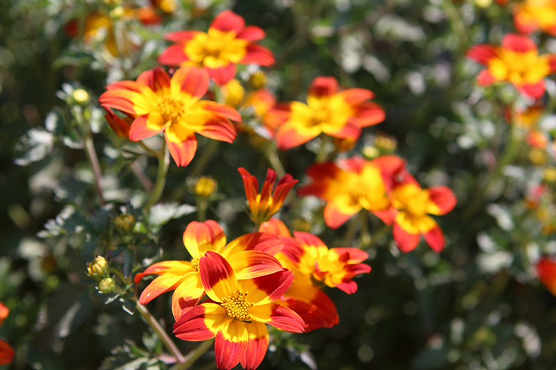 Bee Happy™ Red Bidens has masses of beautiful scarlet daisy flowers with gold eyes and yellow centers at the ends of the stems from late spring to mid fall, which are most effective when planted in groupings. Its small ferny leaves remain green in colour throughout the season.