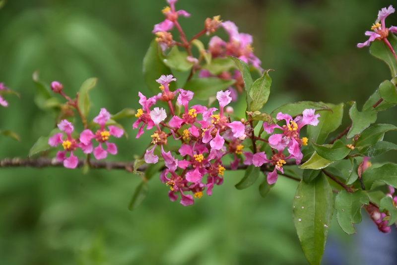 A dwarf variety with a mounded, weeping habit and small, dark green foliage; panicles of pink crapemyrtle-like flowers are followed by ornamental red fruits; requires wind protection; great for borders or containers