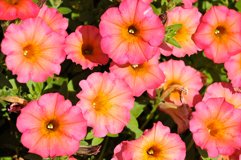 Crazytunia® Mayan Sunset Petunia is covered in stunning coral-pink trumpet-shaped flowers with peach overtones and yellow throats at the ends of the stems from mid spring to late summer. Its pointy leaves remain green in colour throughout the season.