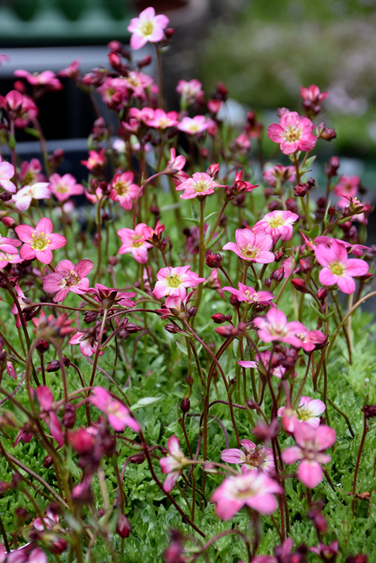 Flower Carpet Saxifrage features tiny pink star-shaped flowers with rose overtones, yellow eyes and white centers at the ends of the stems in late spring. Its needle-like leaves remain emerald green in colour throughout the season.