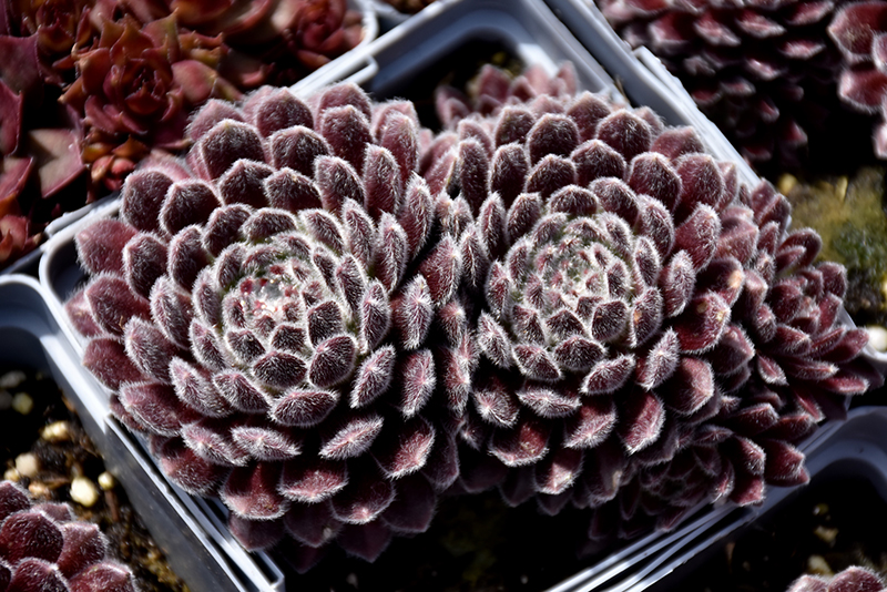 Plum Fuzzy Hens And Chicks will grow to be only 3 inches tall at maturity extending to 10 inches tall with the flowers, with a spread of 12 inches. When grown in masses or used as a bedding plant, individual plants should be spaced approximately 10 inches apart. Its foliage tends to remain low and dense right to the ground. It grows at a medium rate, and under ideal conditions can be expected to live for approximately 20 years. As an herbaceous perennial, this plant will usually die back to the crown each winter, and will regrow from the base each spring. Be careful not to disturb the crown in late winter when it may not be readily seen!