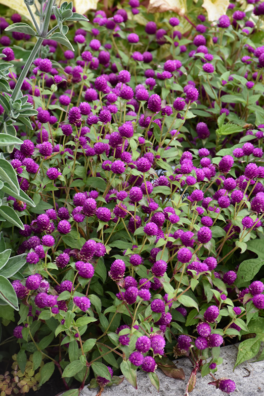 Pinball™ Purple Globe Amaranth will grow to be about 16 inches tall at maturity, with a spread of 20 inches. When grown in masses or used as a bedding plant, individual plants should be spaced approximately 8 inches apart. Its foliage tends to remain dense right to the ground, not requiring facer plants in front. Although it's not a true annual, this plant can be expected to behave as an annual in our climate if left outdoors over the winter, usually needing replacement the following year. As such, gardeners should take into consideration that it will perform differently than it would in its native habitat.