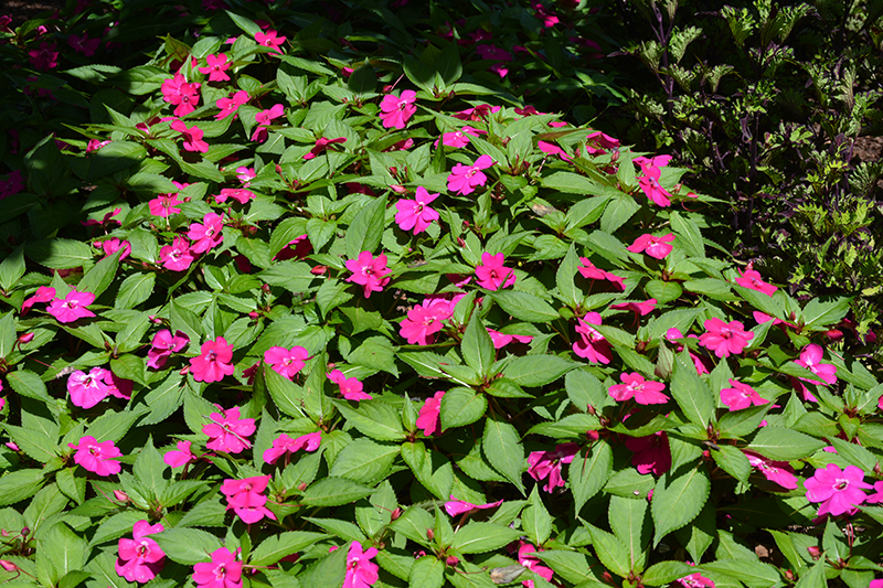 Solarscape™ Neon Purple Impatiens features bold purple round flowers at the ends of the stems from mid spring to early fall. Its pointy leaves remain dark green in colour throughout the season.