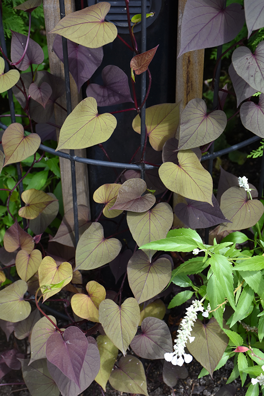 SolarTower™ Black Sweet Potato Vine will grow to be about 4 feet tall at maturity, with a spread of 4 feet. When grown in masses or used as a bedding plant, individual plants should be spaced approximately 30 inches apart. Its foliage tends to remain dense right to the ground, not requiring facer plants in front. The stalks can be weak and so it may require staking in exposed sites or excessively rich soils. This fast-growing annual will normally live for one full growing season, needing replacement the following year.