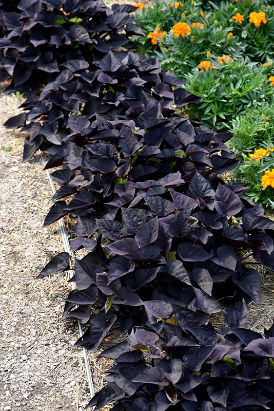 Spotlight™ Black Heart Sweet Potato Vine will grow to be about 10 inches tall at maturity, with a spread of 20 inches. When grown in masses or used as a bedding plant, individual plants should be spaced approximately 14 inches apart. Its foliage tends to remain low and dense right to the ground. This fast-growing annual will normally live for one full growing season, needing replacement the following year.