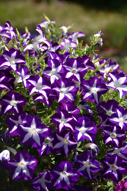Blanket® Blue Star Petunia is blanketed in stunning indigo trumpet-shaped flowers with white stripes at the ends of the stems from mid spring to mid fall. Its pointy leaves remain green in colour throughout the season.