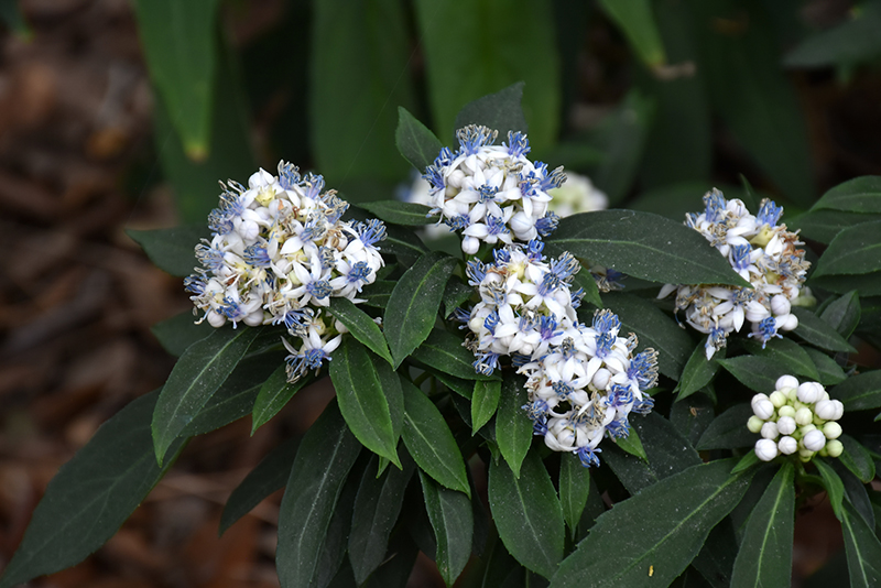 An exotic evergreen shrub from the hydrangea family; branches hold large clusters of white flowers with lavender stamens in late spring, over deep green narrow foliage; berries tend to be more purple-pink than blue; an outstanding landscape accent