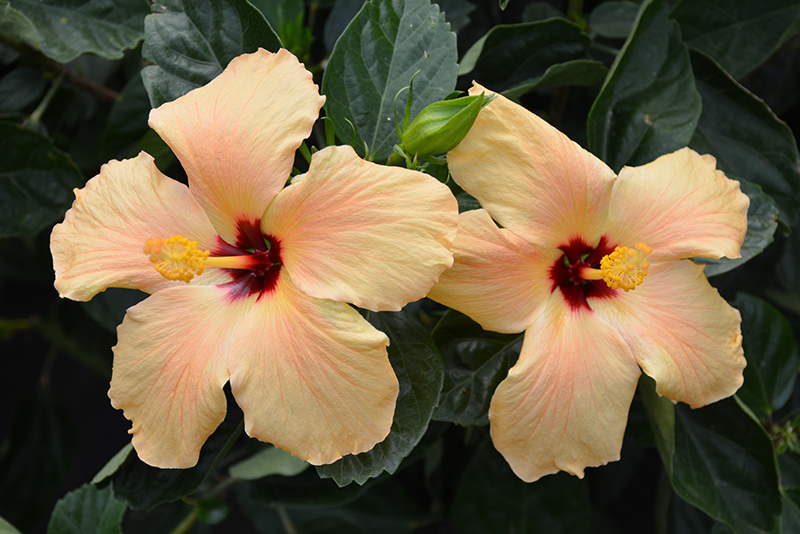Little Tiger Hibiscus features bold peach round flowers with orange overtones and gold anthers at the ends of the branches from mid spring to mid fall. Its serrated oval leaves remain dark green in colour throughout the year.
