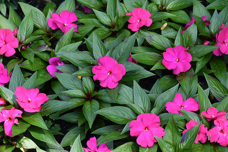 Clockwork™ Purple New Guinea Impatiens will grow to be about 8 inches tall at maturity, with a spread of 12 inches. When grown in masses or used as a bedding plant, individual plants should be spaced approximately 12 inches apart. Its foliage tends to remain low and dense right to the ground. This fast-growing annual will normally live for one full growing season, needing replacement the following year.