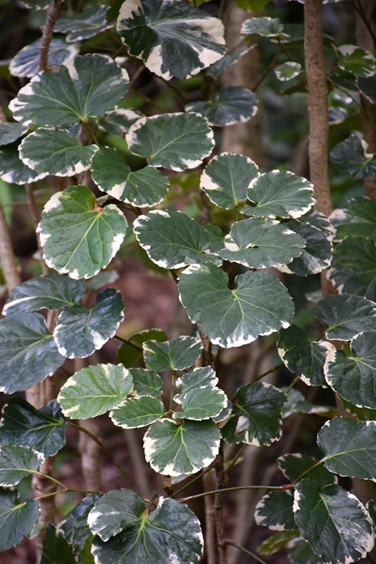 Variegated Geranium Leaf Aralia's attractive glossy round leaves emerge light green in spring, turning grayish green in colour with showy white variegation the rest of the year on a plant with an upright spreading habit of growth.