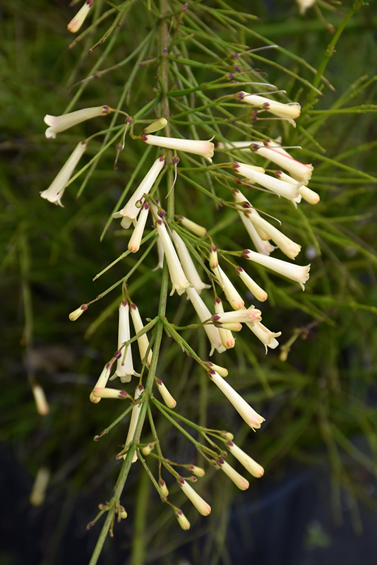 This sub-shrub is a weeping variety with very fine, grassy foliage, producing pendulous butter-yellow tubular flowers all season; prefers full sun and is drought tolerant once established; great for containers, and hanging baskets; overwinter indoors