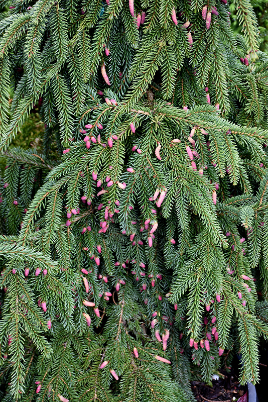 An outstanding upright variety of oriental spruce that features irregular, nodding or weeping branches of blue-green foliage; showy, bright pink male flowers appear in spring; ideal as a specimen to add interest in the landscape with its sculptural look