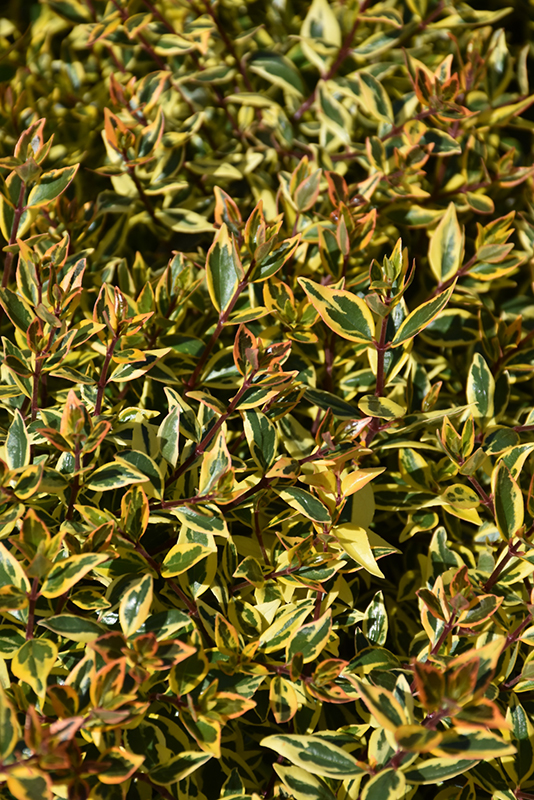 This compact shrub has glossy dark green leaves with bright yellow margins that soften as they mature; new foliage is tinged red; a tidy, mounded habit and tubular white flowers from summer to fall, make this shrub a welcome addition to smaller spaces