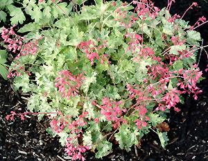 Monet Coral Bells will grow to be about 8 inches tall at maturity extending to 18 inches tall with the flowers, with a spread of 12 inches. When grown in masses or used as a bedding plant, individual plants should be spaced approximately 10 inches apart. Its foliage tends to remain low and dense right to the ground. It grows at a medium rate, and under ideal conditions can be expected to live for approximately 10 years. As an evegreen perennial, this plant will typically keep its form and foliage year-round.