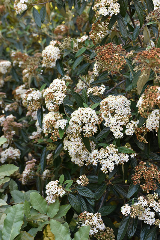An attractive broadleaf evergreen shrub featuring large flat-topped clusters of creamy white flowers in spring and small shiny deep green foliage; tough and adaptable with superior hardiness; protect from winter sun and wind