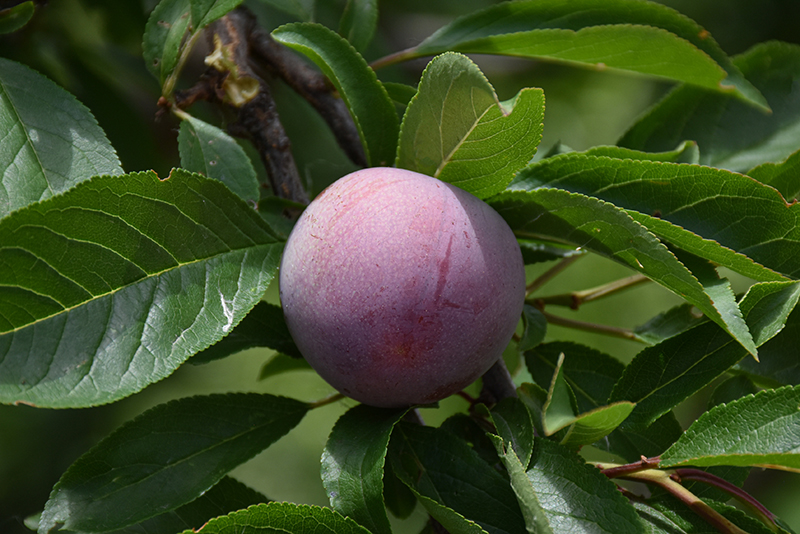 Methley Plum is smothered in stunning clusters of fragrant white flowers along the branches in mid spring before the leaves. It has forest green deciduous foliage. The pointy leaves turn yellow in fall. The fruits are showy crimson drupes with deep purple overtones, which are carried in abundance from mid to late summer. The fruit can be messy if allowed to drop on the lawn or walkways, and may require occasional clean-up.