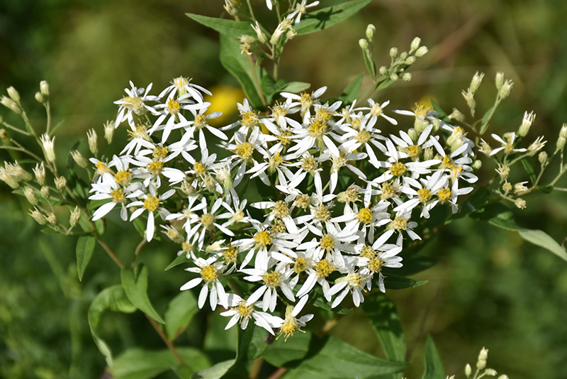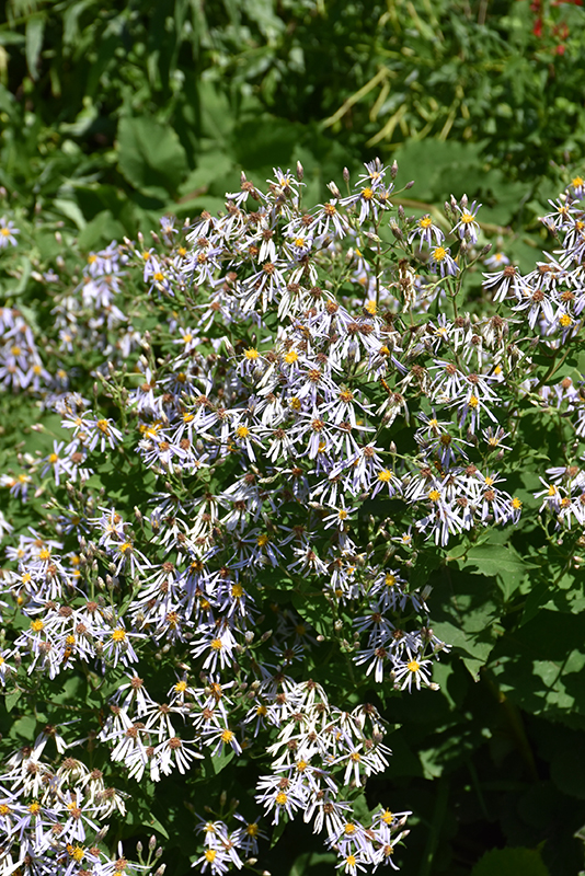 Large-leaved Aster has masses of beautiful white flat-top daisy flowers with violet overtones and gold eyes at the ends of the stems from early summer to mid fall, which are most effective when planted in groupings. Its large serrated heart-shaped leaves remain light green in colour throughout the season.