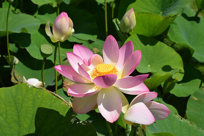 Sacred Pink Lotus is an herbaceous annual with an upright spreading habit of growth. Its relatively coarse texture can be used to stand it apart from other garden plants with finer foliage.