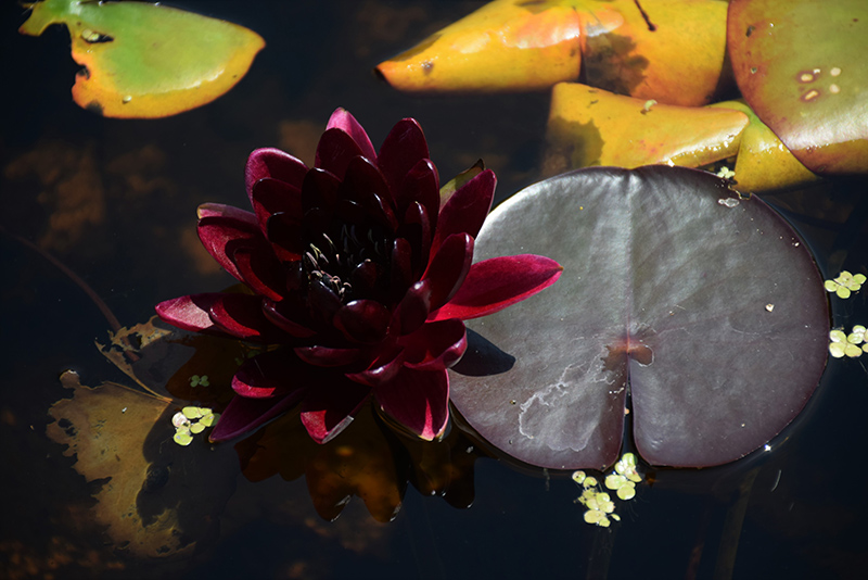 Large, stunning deep red, cup-shaped flowers with near-black centers; purple new leaves gradually mature to shiny green; a beautiful addition to your pond; easy to care for; water lilies dislike moving water