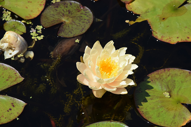 Carolina Sunset Hardy Water Lily features showy fragrant double yellow cup-shaped flowers with peach overtones and gold eyes at the ends of the stems from late spring to early fall. The flowers are excellent for cutting. Its attractive glossy round leaves remain olive green in colour with distinctive deep purple spots throughout the year.