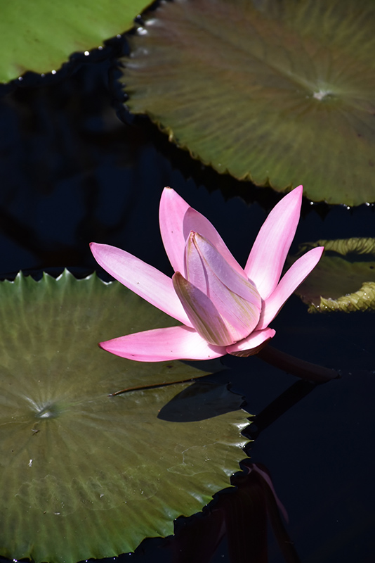 A wonderful night bloomer, producing large, fragrant, fuchsia-red flowers with wider petals; blooms rise above round foliage that is bronze on the topside and mottled greenish brown underneath; water lilies dislike moving water; annual in colder climates