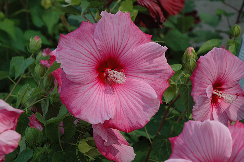 Sweet Caroline Hibiscus features bold pink round flowers with crimson eyes at the ends of the stems from mid summer to early fall, which emerge from distinctive rose flower buds. Its large glossy oval leaves remain dark green in colour throughout the season.