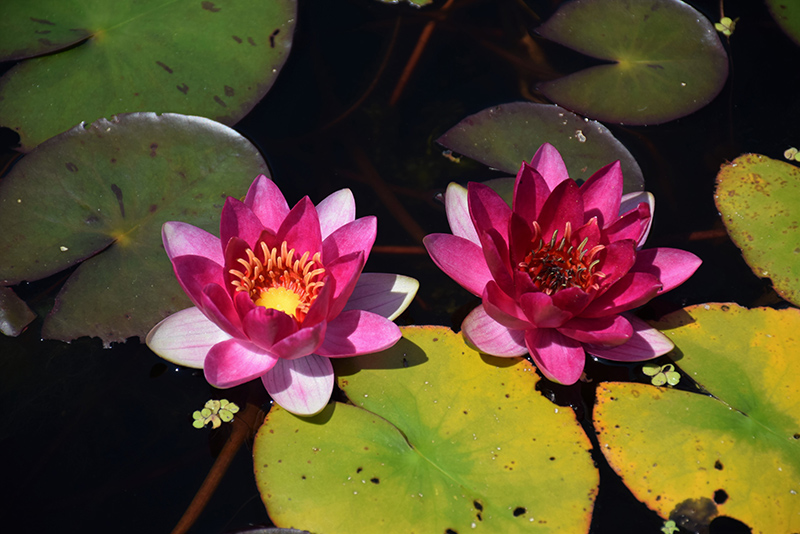 Large, stunning crimson to magenta flowers with golden centers appear over a long season; new leaves blotched with purple mature to plain green; a beautiful addition to your pond; easy to care for; water lilies dislike moving water