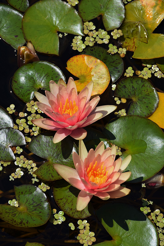 A day-blooming variety presenting oval green leaves, heavily mottled in burgundy; dainty, small, star shaped fragrant flowers open light peach, and then deepen in color as they mature; easy to care for; water lilies dislike moving water