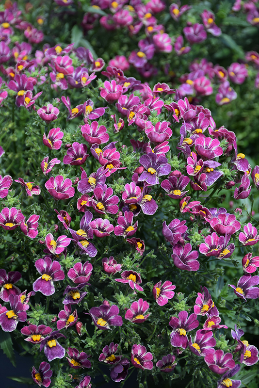 Nesia™ Tutti Frutti Nemesia features dainty spikes of lightly-scented fuchsia pea-like flowers with white overtones, yellow eyes and a plum purple flare at the ends of the stems from mid spring to late summer. Its small serrated pointy leaves remain green in colour throughout the season.
