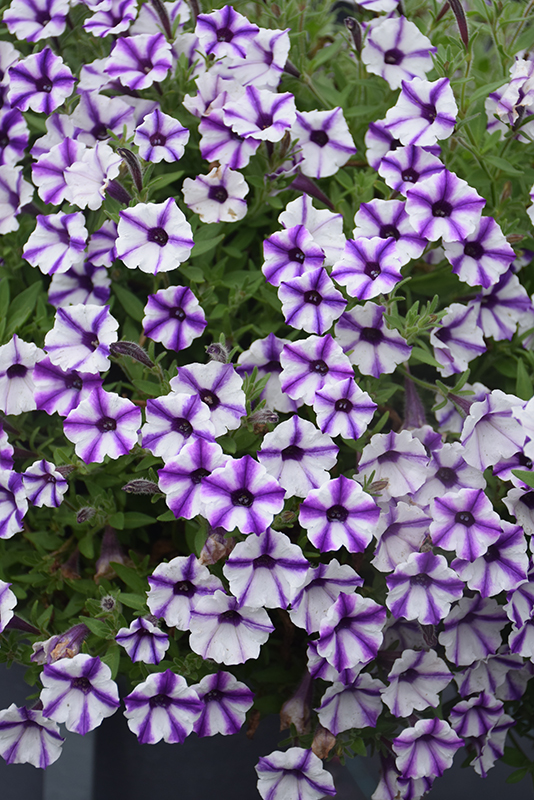 Supertunia Mini Vista® Violet Star Petunia is covered in stunning white trumpet-shaped flowers with violet stripes at the ends of the stems from mid spring to mid fall. Its pointy leaves remain green in colour throughout the season.