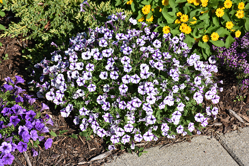 Supertunia Mini Vista® Violet Star Petunia is a dense herbaceous annual with a trailing habit of growth, eventually spilling over the edges of hanging baskets and containers. Its medium texture blends into the garden, but can always be balanced by a couple of finer or coarser plants for an effective composition.
