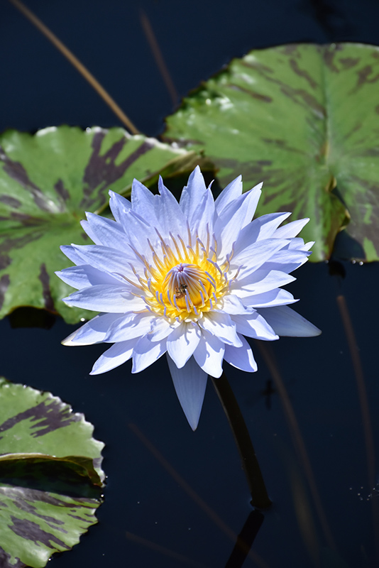 A wonderful selection producing large, fragrant, sky blue flowers with golden-yellow centers; blooms rise above large, round, dark green foliage streaked with maroon; water lilies dislike moving water; annual in colder climates