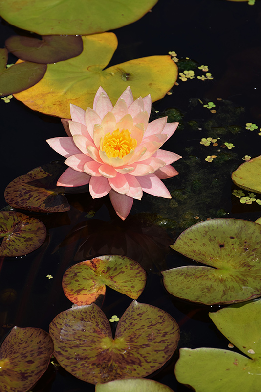 Stunning, peony-shaped flowers feature a mix of pink, peach, and yellow, with golden-yellow centers; attractive green leaves are speckled with purple when young; very free flowering; a beautiful addition to your pond; water lilies dislike moving water