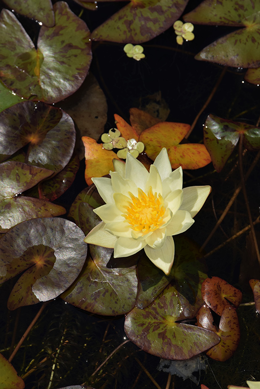 Small, dainty, pale yellow flowers with golden-yellow centers; attractive, tiny green leaves are mottled in burgundy; a beautiful addition to a small pond or container garden; easy to care for; water lilies dislike moving water