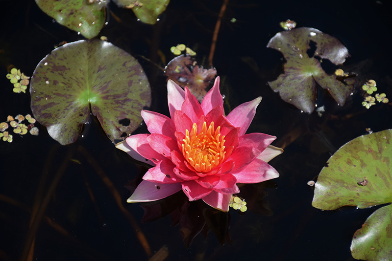Robinsoniana Hardy Water Lily features showy fragrant semi-double orange cup-shaped flowers with red overtones, yellow eyes and gold anthers at the ends of the stems from early summer to early fall. The flowers are excellent for cutting. Its attractive glossy round leaves remain dark green in colour with distinctive purple spots throughout the year.