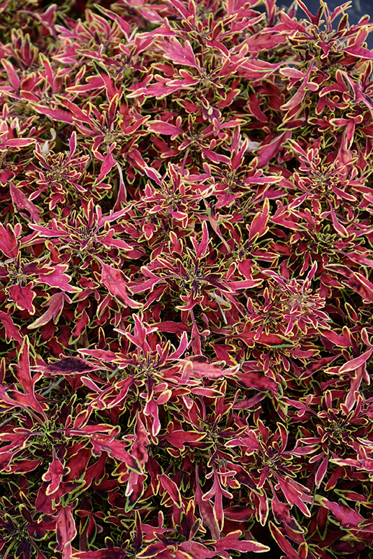 ColorBlaze® Mini Me™ Watermelon Coleus' attractive serrated pointy leaves remain ruby-red in colour with distinctive chartreuse edges throughout the year on a plant with an upright spreading habit of growth.