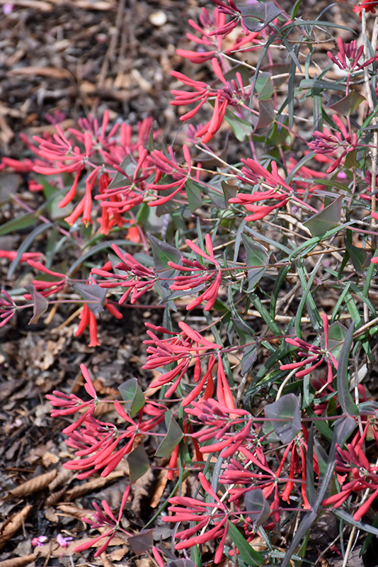 Leo Trumpet Honeysuckle features showy clusters of scarlet trumpet-shaped flowers with yellow throats at the ends of the branches from early summer to mid fall. It features an abundance of magnificent red berries from mid to late fall. It has bluish-green deciduous foliage which emerges burgundy in spring. The oval leaves do not develop any appreciable fall colour.