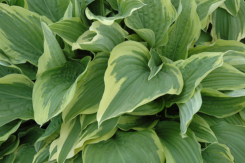 A densely mounded, sun tolerant variety great for borders, beds and containers; dark green leaves with margins ranging from creamy white to golden yellow depending on sun exposure; lavender flowers appear on tall scapes during the midsummer months