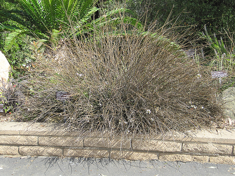 An upright slender shrub producing erect or ascending stems, from a taproot, that are leafless with little branching; clusters of tiny white flowers bloom from late summer to winter; may die back to the ground in zone 8; an excellent container plant