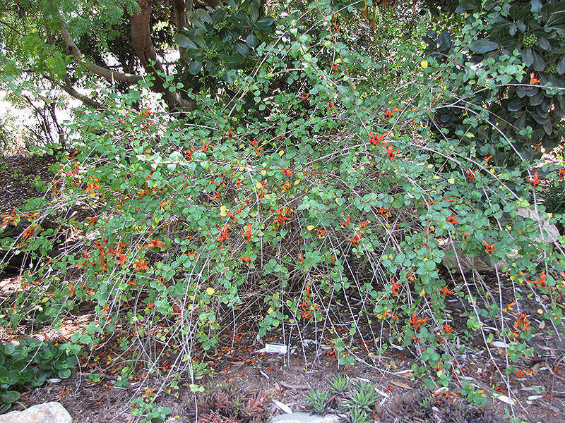 A sprawling, evergreen shrub with shiny, oval, green leaves; red to orange, or sometimes yellow flowers with contrasting glossy black centers appear in warmer months, or year round in frost free areas; best with regular moisture and fertile soil