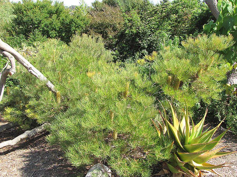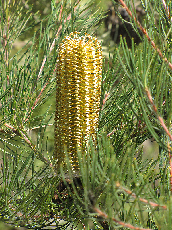 Cunningham's Banksia features showy spikes of yellow pincushion flowers along the branches from late fall to early winter. The flowers are excellent for cutting. It has attractive dark green foliage with silver undersides. The needles are highly ornamental and remain dark green throughout the winter. The smooth gray bark adds an interesting dimension to the landscape.