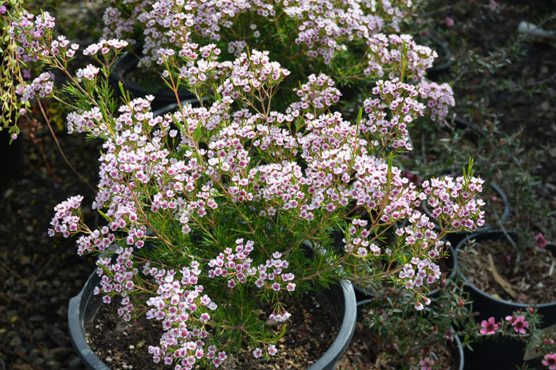 Southern Stars Waxflower features showy clusters of white cup-shaped flowers with shell pink overtones and fuchsia centers at the ends of the branches from mid winter to mid spring. The flowers are excellent for cutting. It has attractive green evergreen foliage. The needles are highly ornamental and remain green throughout the winter. The coppery-bronze branches are extremely showy and add significant winter interest.