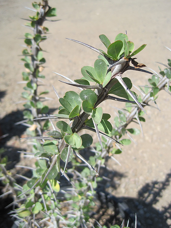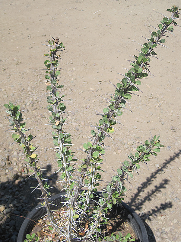 This distinctive succulent features upright spiny branches forming a vase-shaped habit; small, fleshy, rounded green leaves line the branches, and are drought-deciduous; bright red tubular flower clusters appear in spring; great as a hedge or screen