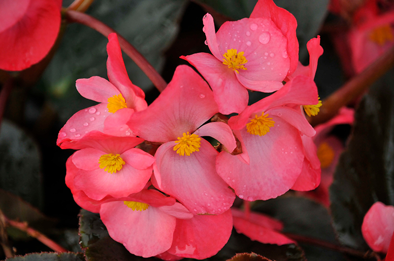 Bionic™ Bronze Leaf Rose Begonia features dainty clusters of rose orchid-like flowers with yellow throats at the ends of the stems from mid spring to mid fall. Its attractive glossy heart-shaped leaves remain dark green in colour with hints of coppery-bronze throughout the season.